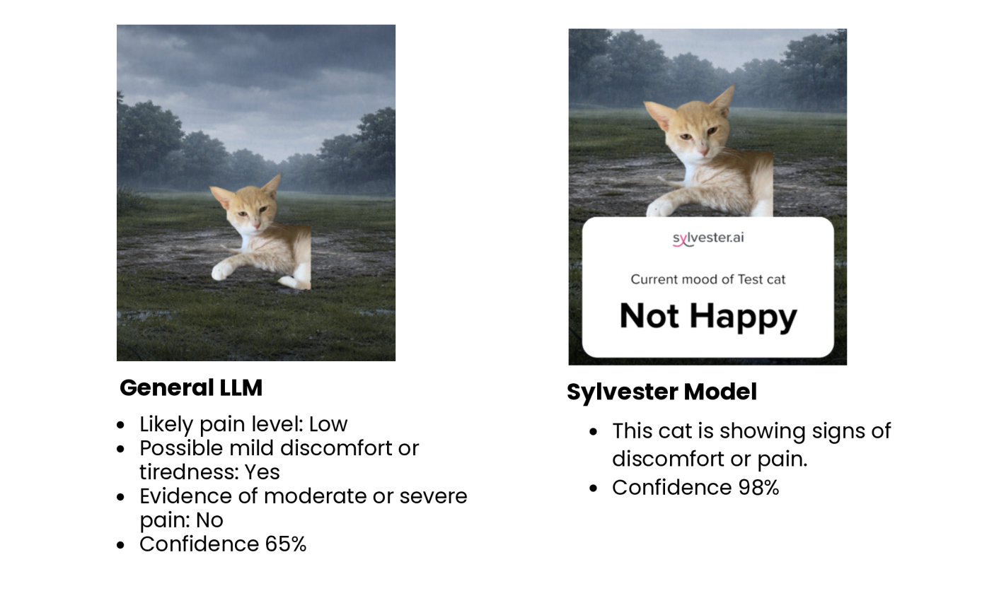 Our research demonstrates the specialized interpretive capabilities of the Sylvester model compared to general Large Language Models (LLMs). When presented with identical images of a cat—one in a gloomy setting and one in a sunny setting—a general LLM's assessment of the cat's pain or discomfort was inconsistent and influenced by the background. In contrast, the Sylvester model consistently identified the cat as being in discomfort in both images, highlighting its enhanced ability to interpret subtle facial cues regardless of environmental factors. This interpretation was independently validated: a trained behaviourist confirmed the cat was experiencing pain, which was later diagnosed as severe dental disease requiring caudal mouth extractions.